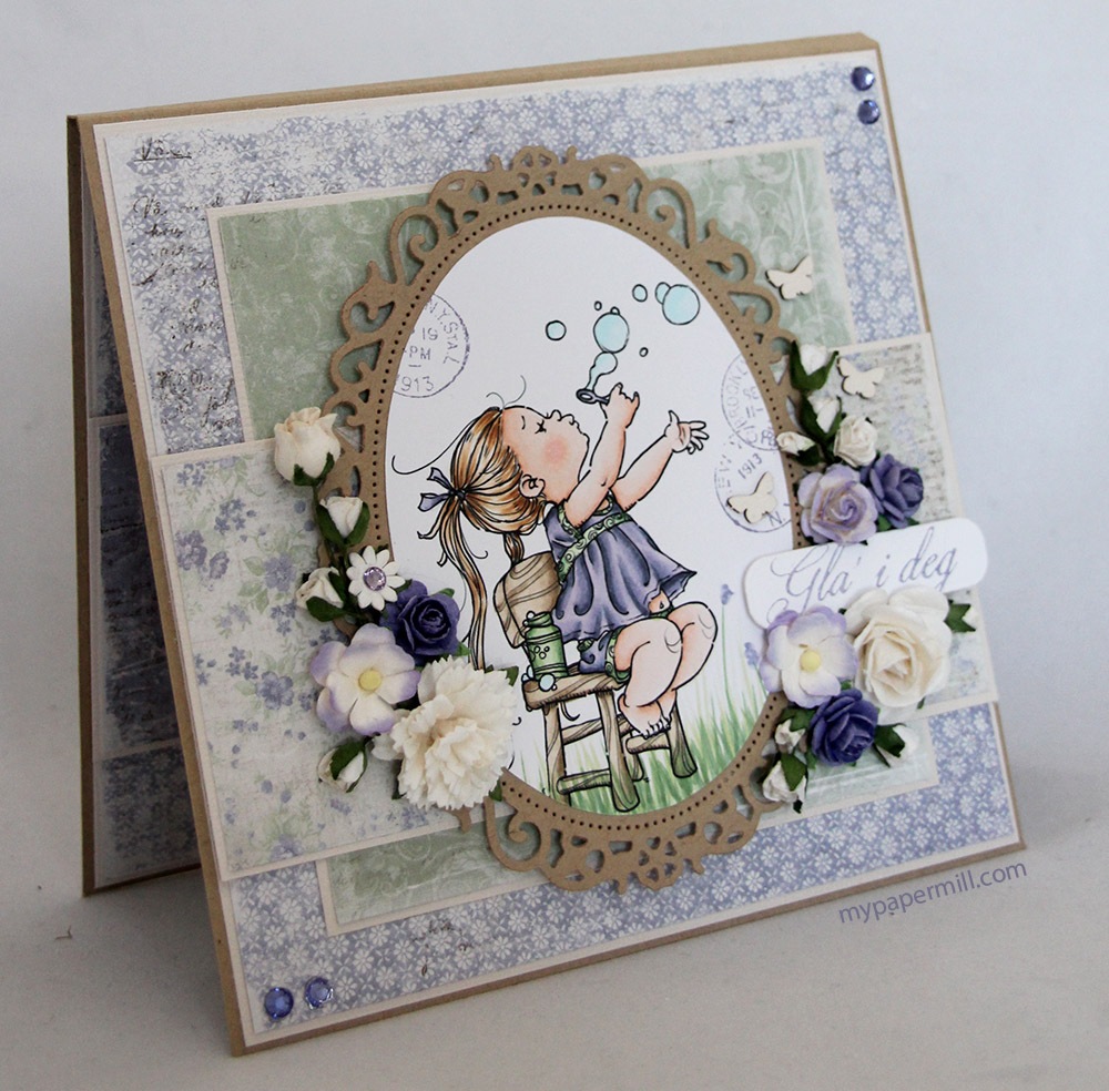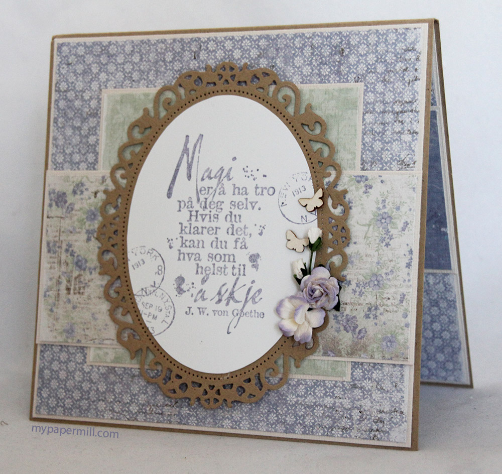 Jeg har brukt arkene 8th of April, 10th of April, 11th of April og 10th of March fra Vintage Spring Basics-serien, og The elegant Wine house fra Sofiero-kolleksjonen. Jeg har brukt den største dieen i Floral Ovals-settet til Spellbinders på kraftkartongen og klippet ut motivet for hånd for å få ovalen riktig. Det irriterer meg litt at ingen av oval-settene til Spellbinders passer til Floral Ovals-settet…