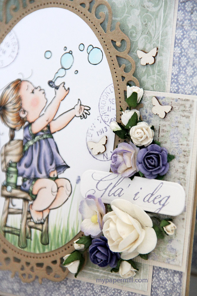 Another staple on my cards: flowers. This is a mix of flowers from Papirdesign and Wild Orchid Crafts. Gla’ i deg (love you) is a stamp from North Star. I’ve used second generation stamping with Plum Pudding ink from Papertrey Ink – it matches the purple in the patterned paper perfectly. I diecut my sentiment using the smallest die in the Labels Trio die set from Spellbinders and layered up on 3D foam to make the sentiment stand out a little and not drown completely in the flower cluster. The little butterflies are chipoboard pieces from Wycinanka.