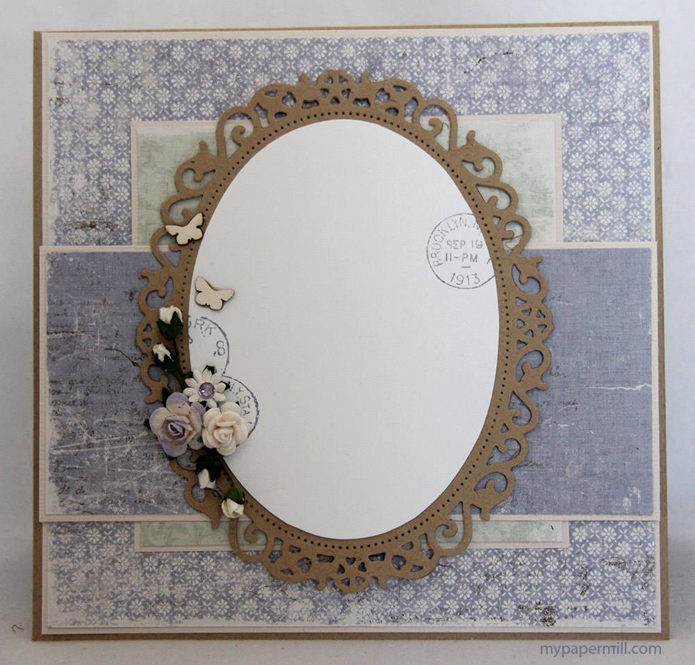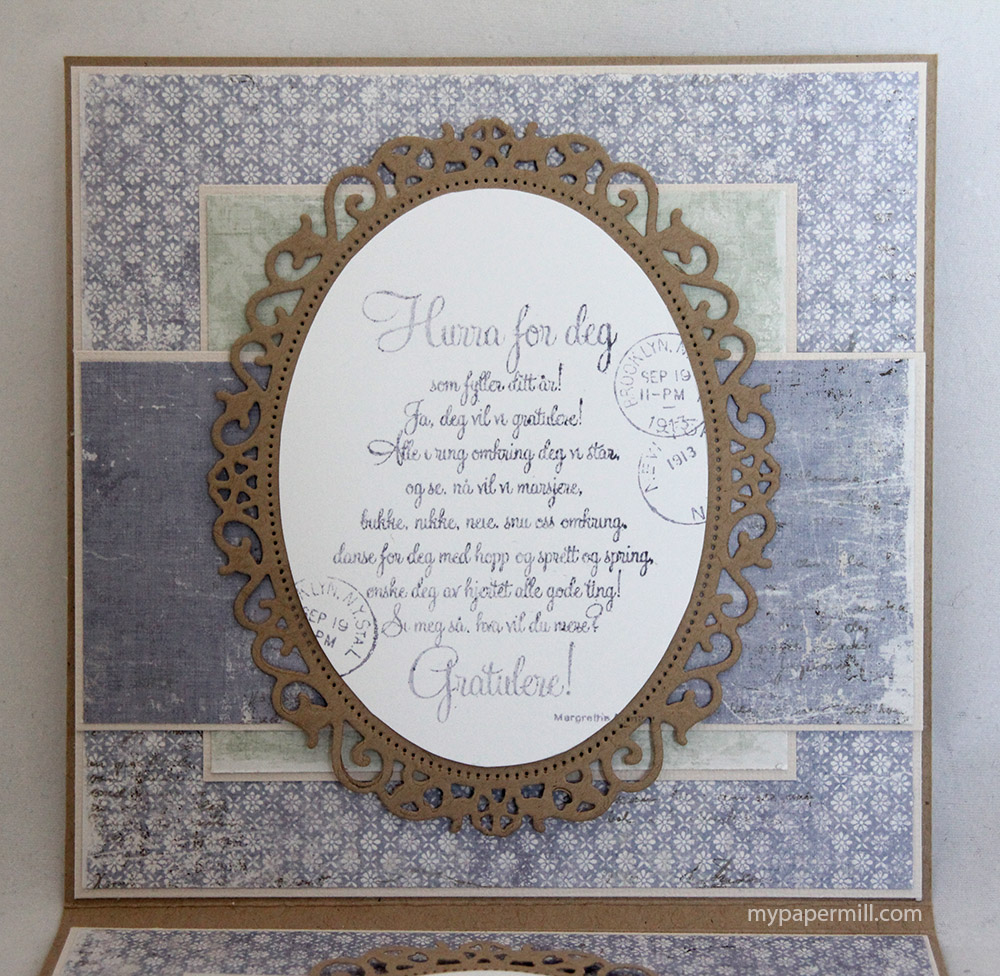 I’ve used 8th of April, 10th of April, 11th of April, and 10th of March from Maja Design’s Vintage Spring Basics line, and The elegant Wine house from the Sofiero line. I used the largest die in Spellbinders’ Floral Ovals set on my kraft cardstock and cut the panel with the image with scissors to get the oval just right. It kind of bugs me that none of Spellbinders’ regular ovals sets match the Floral Ovals set…