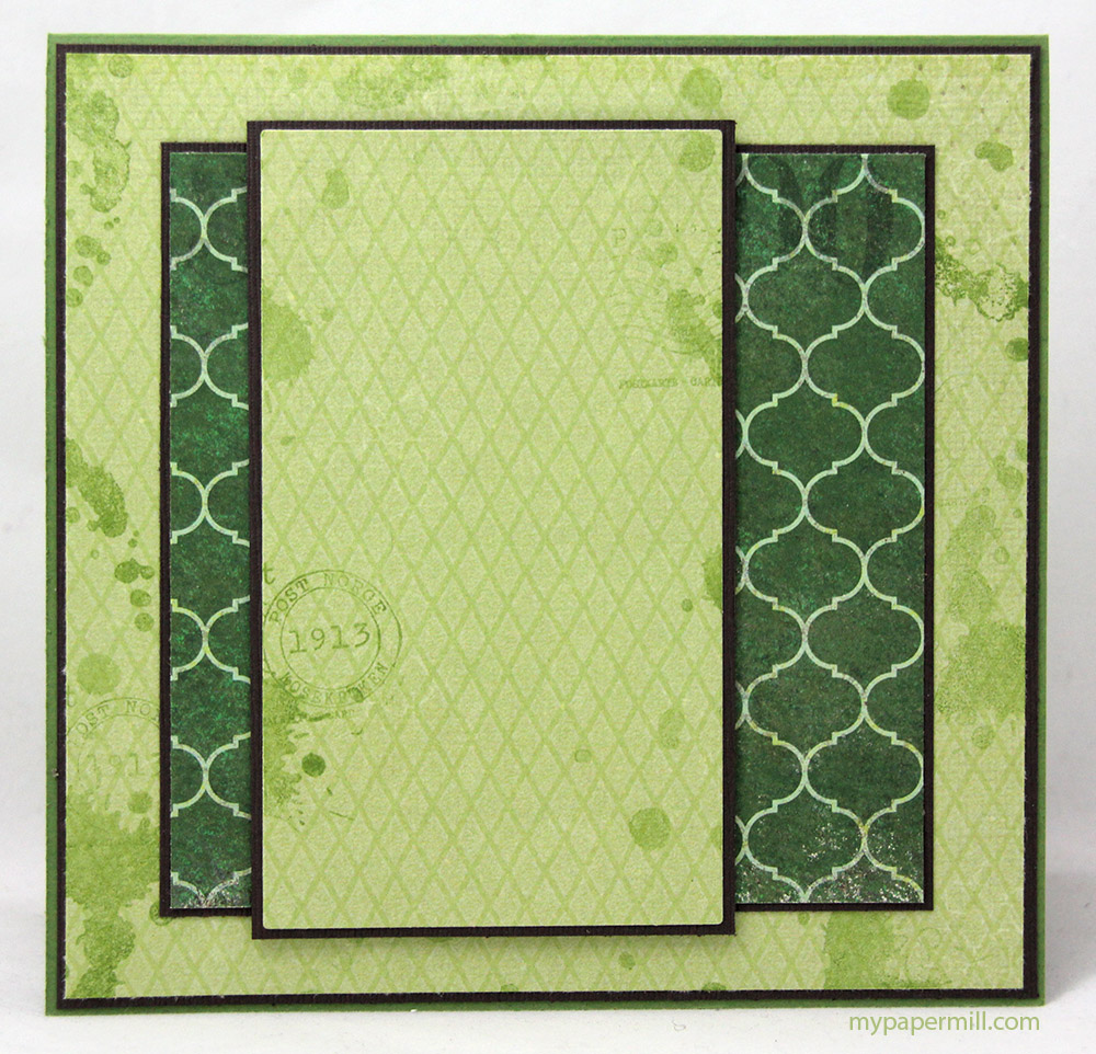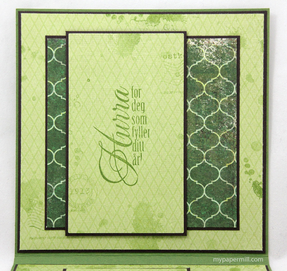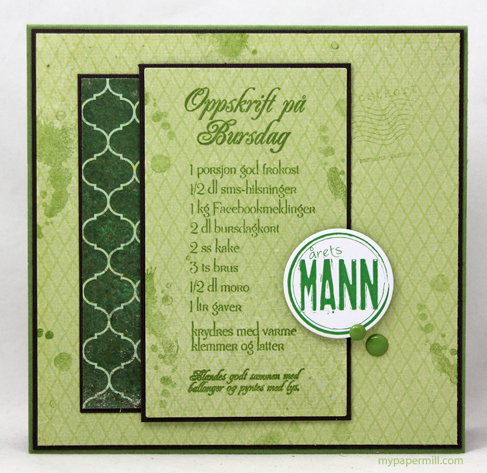 Ark fra Pion Design var også en gjenganger da jeg startet med denne hobbyen, og det lysegrønne arket er Images fra Vintage Garden-serien. Kantstempling var også noe jeg gjorde mye av i starten, og her har jeg brukt Splatter, avlang-stempelet fra North Star og Poststempel, kosekroken-stempelet til kantstemplingen min, begge stemplene er annengangsstemplet med fargen Bamboo Leaves fra Memento. Bursdagsstempelet er stemplet med Bamboo Leaves-fargen rett på mønsterarket og lagt på dobbel matte før hele sulamitten er puttet på 3D-puter for dimensjon.