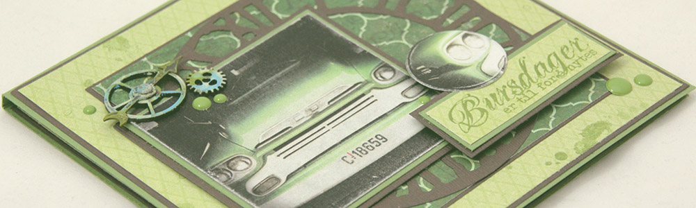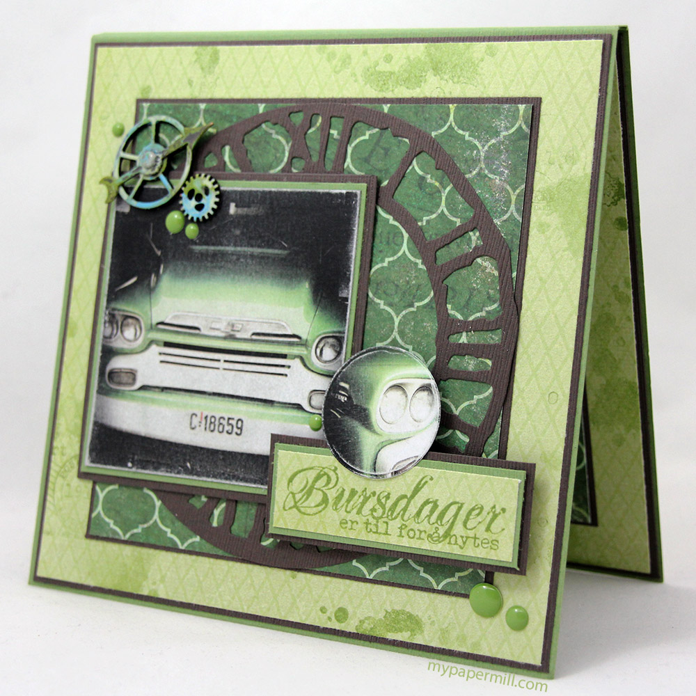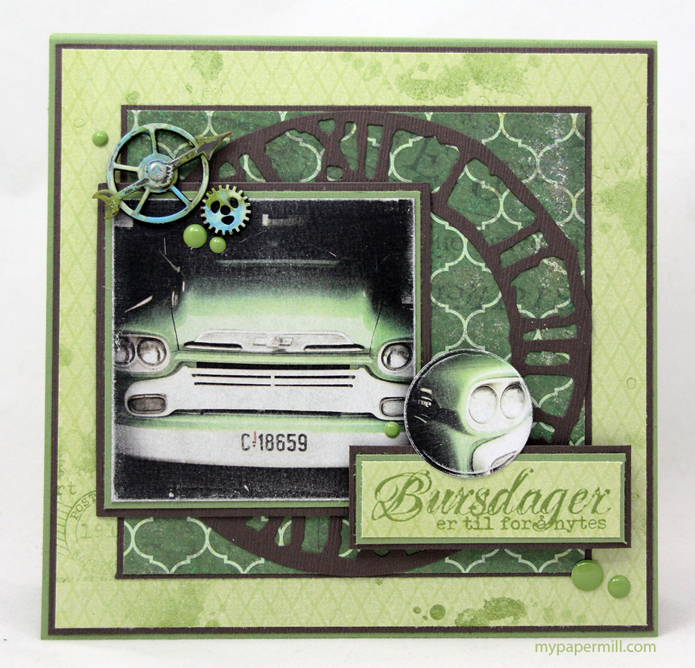 Selve bildet av bilen har jeg gjort litt mer grungy ved å gå over med en pussekloss. Tannhjul og game spinner fra Tim Holtz har blitt behandlet med Distress Paint i fargene Bundled Sage, Broken China og Peeled Paint. De grønne dottene kommer fra Papirdesign. Det samme gjør det mørkegrønne mønsterarket, det heter Jakob og er fra fjorårets vårkolleksjon.