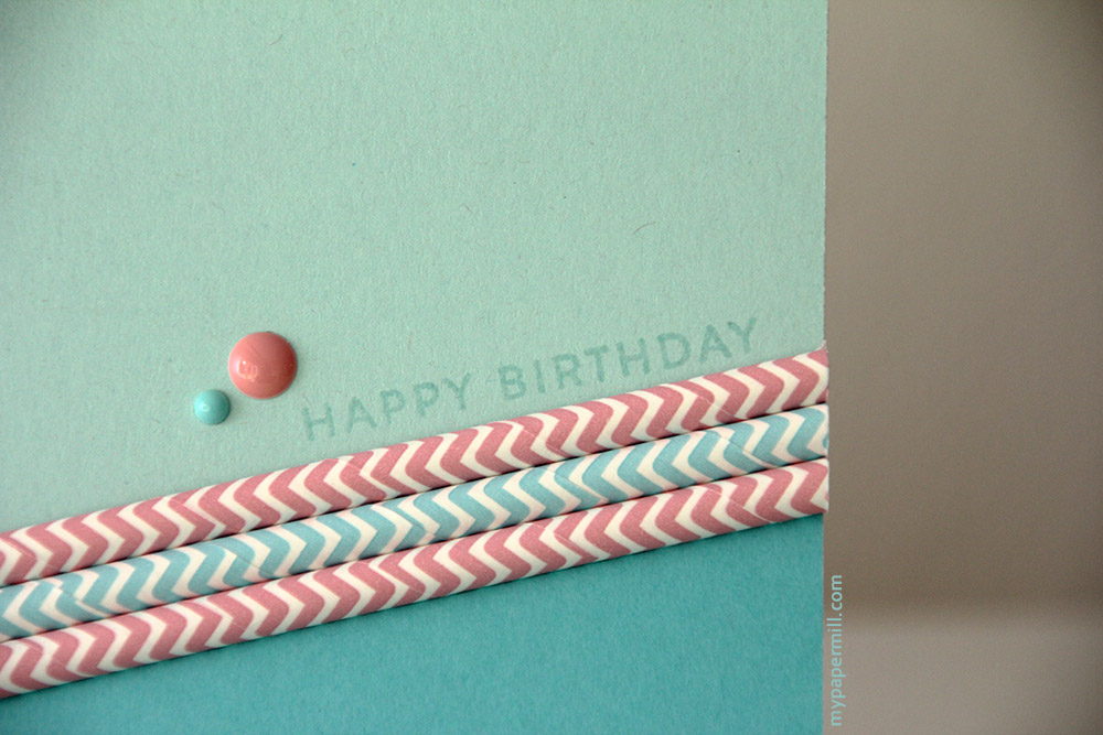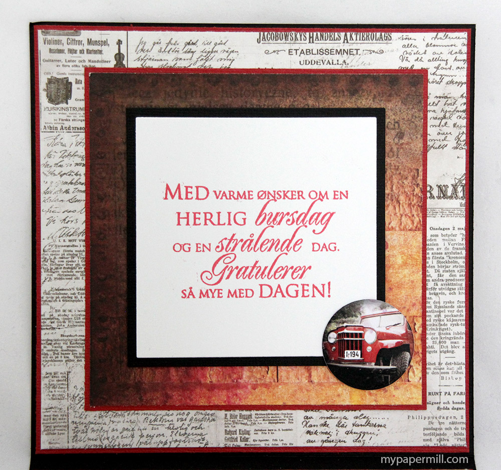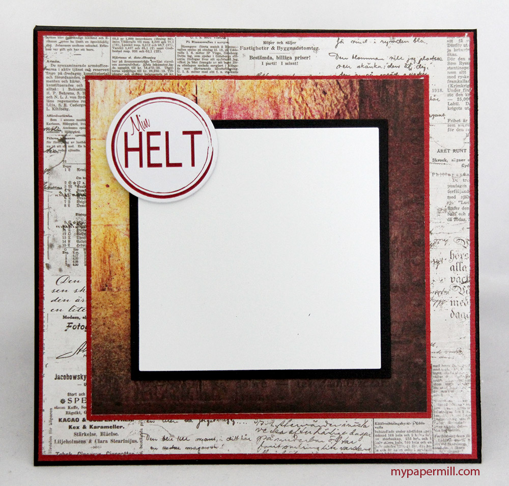 Jeg har blitt veldig glad i å bruke mønsterarkrester på mine kort, og bortsett fra arket med håndskriften (Sewing Collage fra Alma’s Sewing Room-serien til Pion Design) har jeg kun brukt rester fra Maja Design på dette kortet – 8th of March fra Vintage Spring Basics-serien og 1916 fra Vintage Summer Basics. Tekststempelet kommer fra denne platen og er stemplet i fargen Enchanted Evening fra Papertrey Ink på en liten bit mønsterark jeg har stanset ut med en die fra Labels Trio-settet til Spellbinders.
