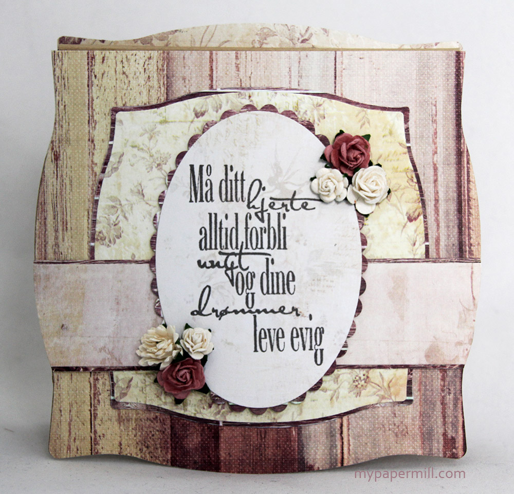 Det siste kortet ble laget et par dager etter at de andre var ferdige. Her ble det et lite sammensurium av kolleksjoner. Panelet teksten er på er fra Grandma’s School Book, det blå mønsterarket kommer fra Till mor-serien og frimerkene inni fra Vintage Garden-serien. For å få litt mer liv på forsiden av kortet stanset jeg ut noen sommerfugler med en Martha Stewart-punch og limte på. Knappen på dette kortet kommer fra Papertrey Ink og båndet fra North Star Design.