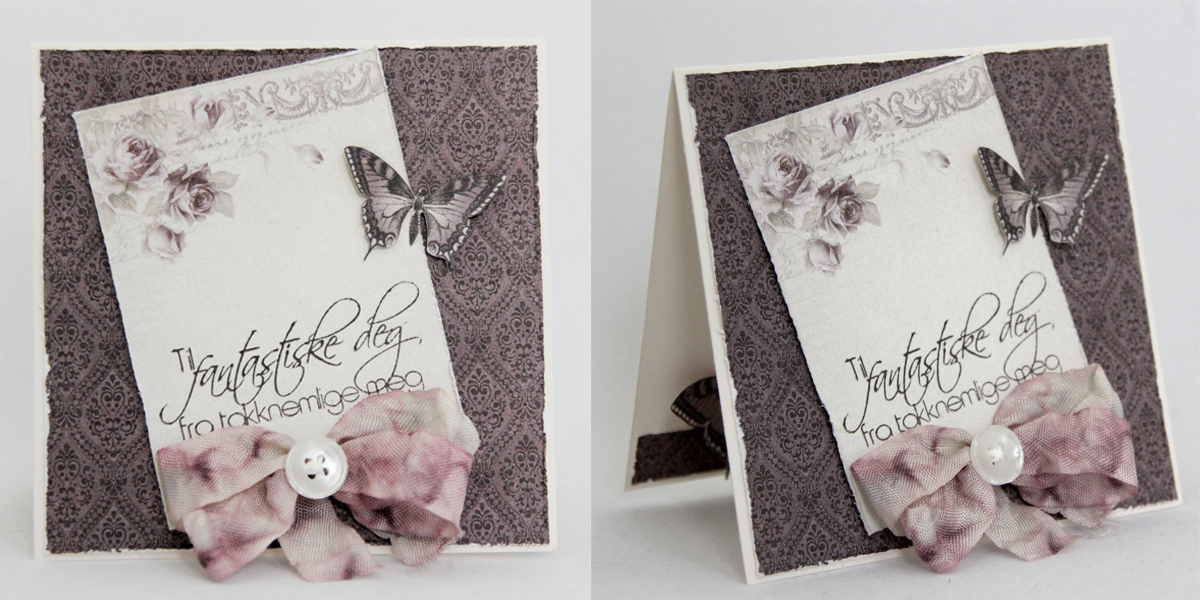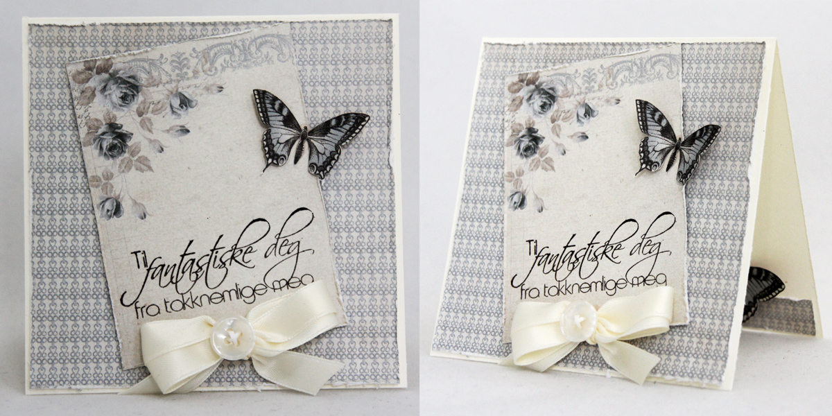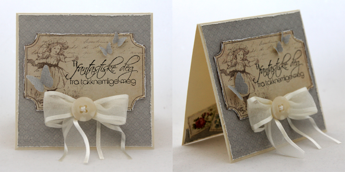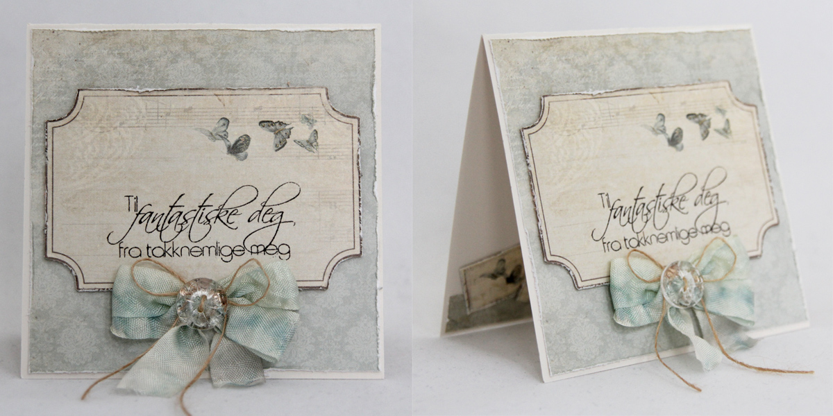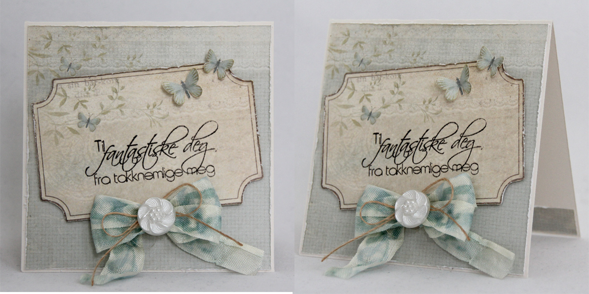 Alle kortene er laget på samme måte, med små forskjeller mellom dem. Basen er 4×4” ferdig brettet, og her har jeg ikke engang laget rygg. Jeg har pyntet med ark og elementer fra utklippsark fra Pion, og stemplet Til fantastiske deg fra takknemlige meg-stempelet fra North Star Design foran på alle kortene. Jeg har satt på knapp og sløyfe for at det skal være noe mer enn bare papir på disse kortene. Inni kortene har jeg en ½” stripe med det samme mønsterarket som på fronten av kortet, i tillegg til små frimerker eller sommerfugler, også klippet ut fra Pion-arkene. Spesielt mye enklere kan det ikke gjøres.