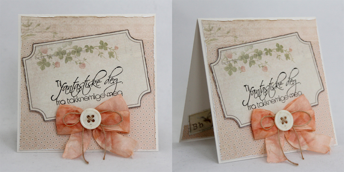 Enda et kort i lakserosa-/ferskenfarge. Jeg har brukt et annet bakgrunnsark på dette enn det forrige kortet i samme farge, litt andre frimerker og en annen knapp, ellers er de ganske like.
