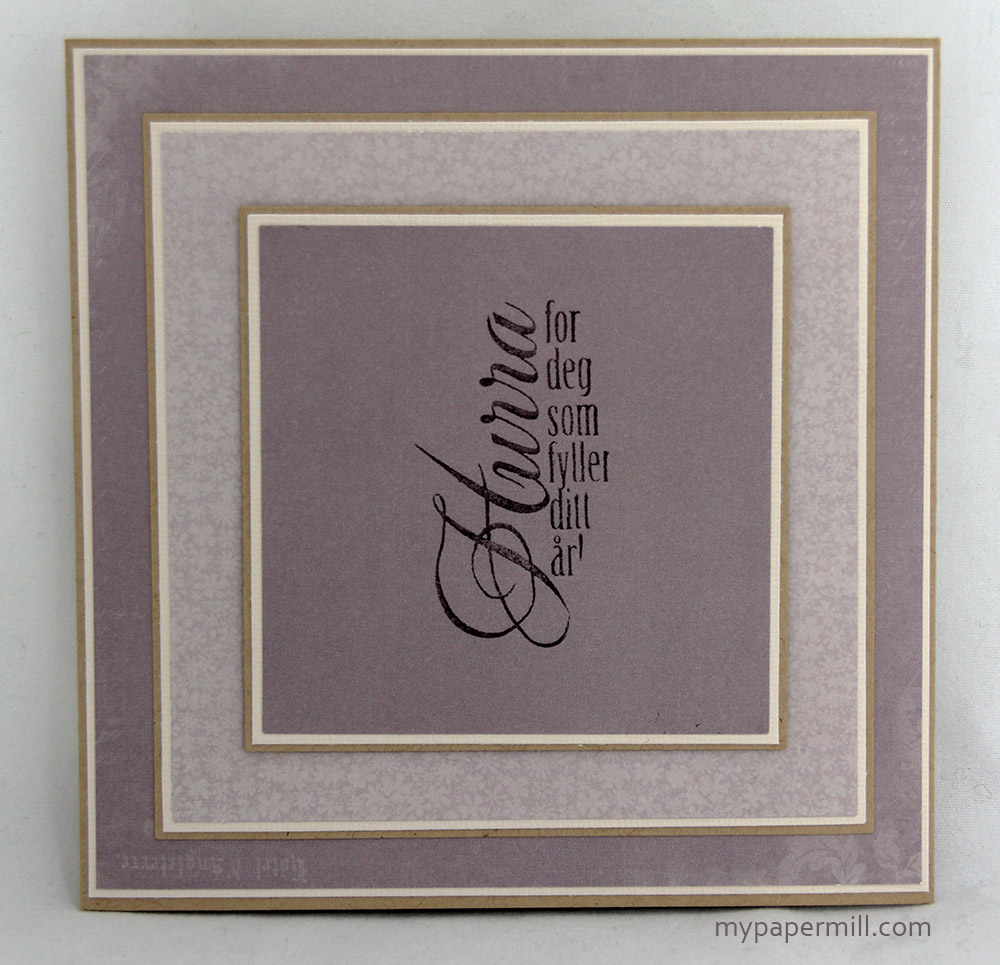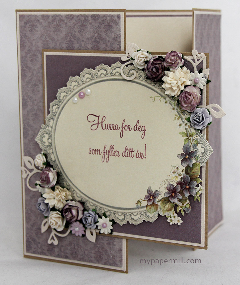 Det ble et gatefold-kort denne gangen, laget på DT-treffet vi hadde hos Heidi den første helgen i mai. Basen til kortet er Bazzill Kraft, og jeg har brukt Vanilla (den gamle typen, jeg er heldig nok til å ha et lite lager fremdeles) under Viola-arket fra Flower Frames-serien til Pion Design. Hurra for deg-stempelet går egentlig over én linje, men jeg driver litt med stempelmassakre og har klippet stempelet mitt i to. Da passer det perfekt i en ramme som her, stemplet i fargen Sweet Plum fra Memento. Alle blomstene kommer fra nettbutikken, og jeg har fjernet midten på kamilleblomstene for å sette på perler i mer riktig farge fra Kaisercraft og Magnolia. Noen av blomstene er farget med Copics for å bli lilla, siden jeg ikke hadde lillafarge på blomstene i utgangspunktet.