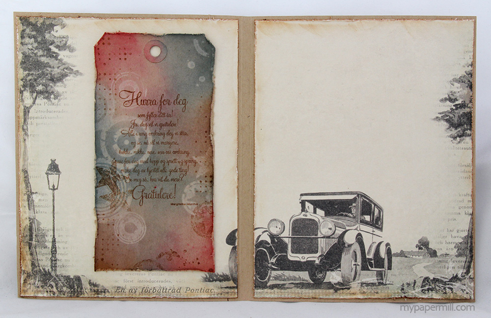 Baksiden med mer distress ink, Tim Holtz-stempler og whitewash-teknikk. Tekststempelet kommer fra Stempelglede.