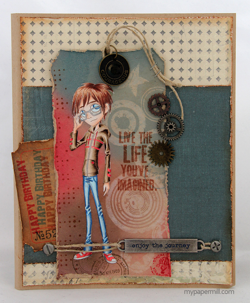 For leeeeeenge siden (tror det var i 2012 eller 2013) lagde jeg dette kortet til en oppgave i Kort-o-mania på scrapping.no. Hvis jeg ikke husker feil måtte man bruke tag på kortet sitt. Ikke husker jeg hvem som vant oppgaven, og ikke husker jeg hvordan det gikk, men dette var hvertfall mitt bidrag. I min verden er ikke kort ferdig før innsidene og baksiden er ferdig, så dette kortet ble ferdig i år! Ikke klarer jeg å finne beskrivelsen min heller, så oversikt over materialbruk blir så som så. Motivet er hvertfall fra Tickled Pink, mønsterarkene fra Pion Design, metallpynt fra Tim Holtz (bortsett fra skruene, de tror jeg er Making Memories). Ellers er stemplene en salig blanding. Happy birthday-stempelet kommer fra Magnolia, poststemplene kommer fra Basic Grey og resten er fra Tim Holtz. På tagen har jeg brukt distress ink og whitewash-teknikk.
