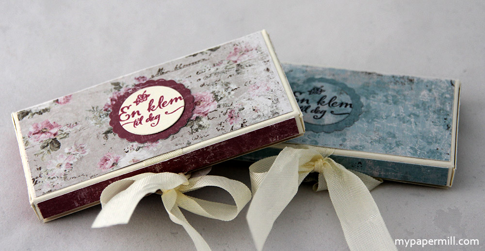 Jeg har brukt ark fra Vintage Summer Basics-serien til Maja Design. På den til venstre har jeg også brukt litt av Coffee in the Arbour-kolleksjonen inni esken. Jeg har stemplet et hashtagstempel fra North Star Design og satt på noen perler, og det er det hele.