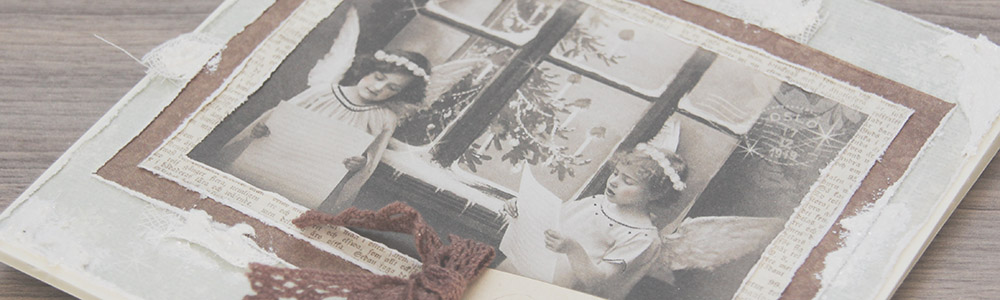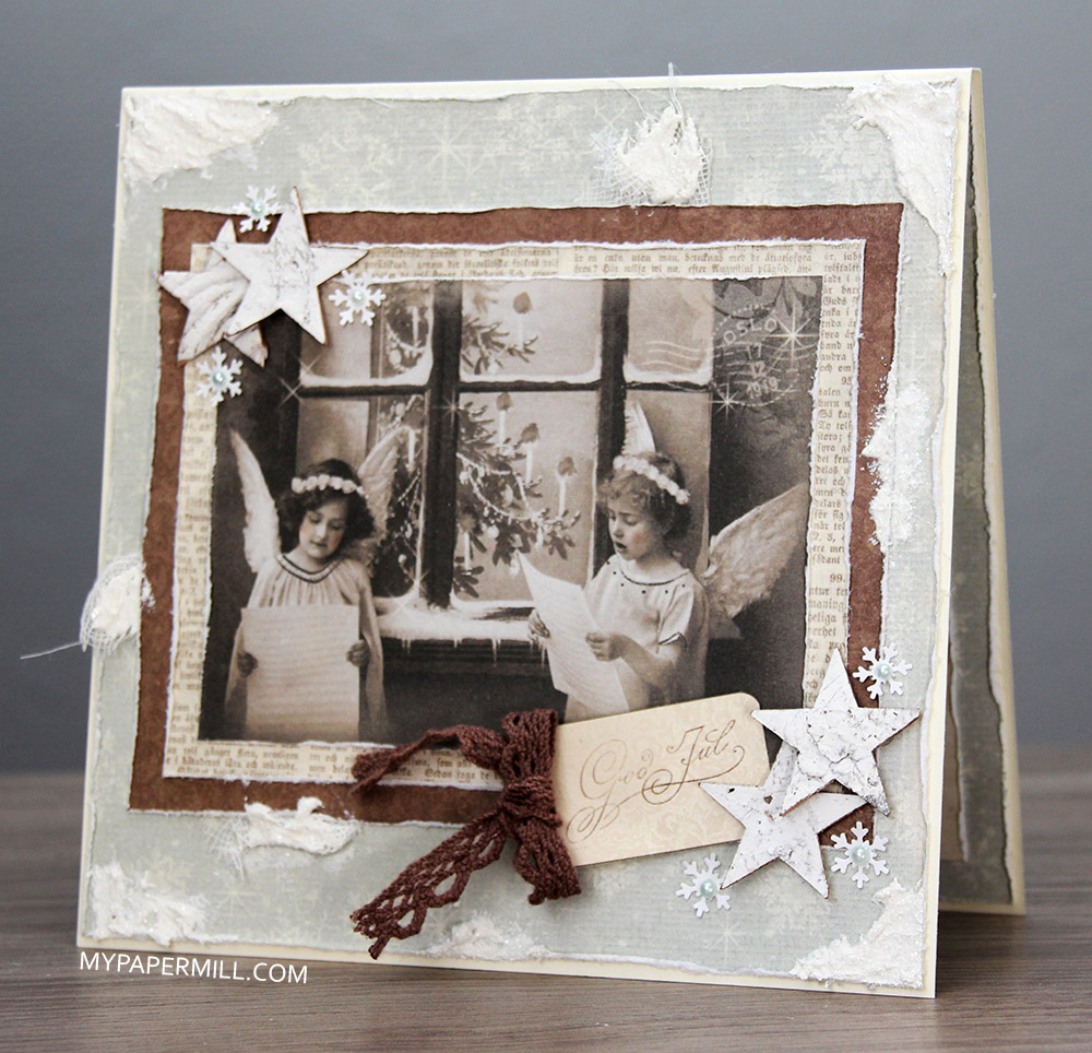 Hovedmotivet kommer fra Christmas Blessings-arket fra Grandma’s Attic-serien, arket er nytt! Ellers har jeg brukt et sammensurium av ark fra tidligere kolleksjoner, her er både Silent Night, Wintertime in Swedish Lapland og Väntan på Tomten II representert. Jeg har stukket noen biter med osteklut under motivet og malt litt her og der med snow paint, som jeg har strødd rock candy distressglitter over. Jeg har pyntet med noen stjerner av bark og brukte Aspen Snowflake-punchen min til å lage de små snøfnuggene jeg har limt på. De har fått perler fra Kaisercraft i midten.