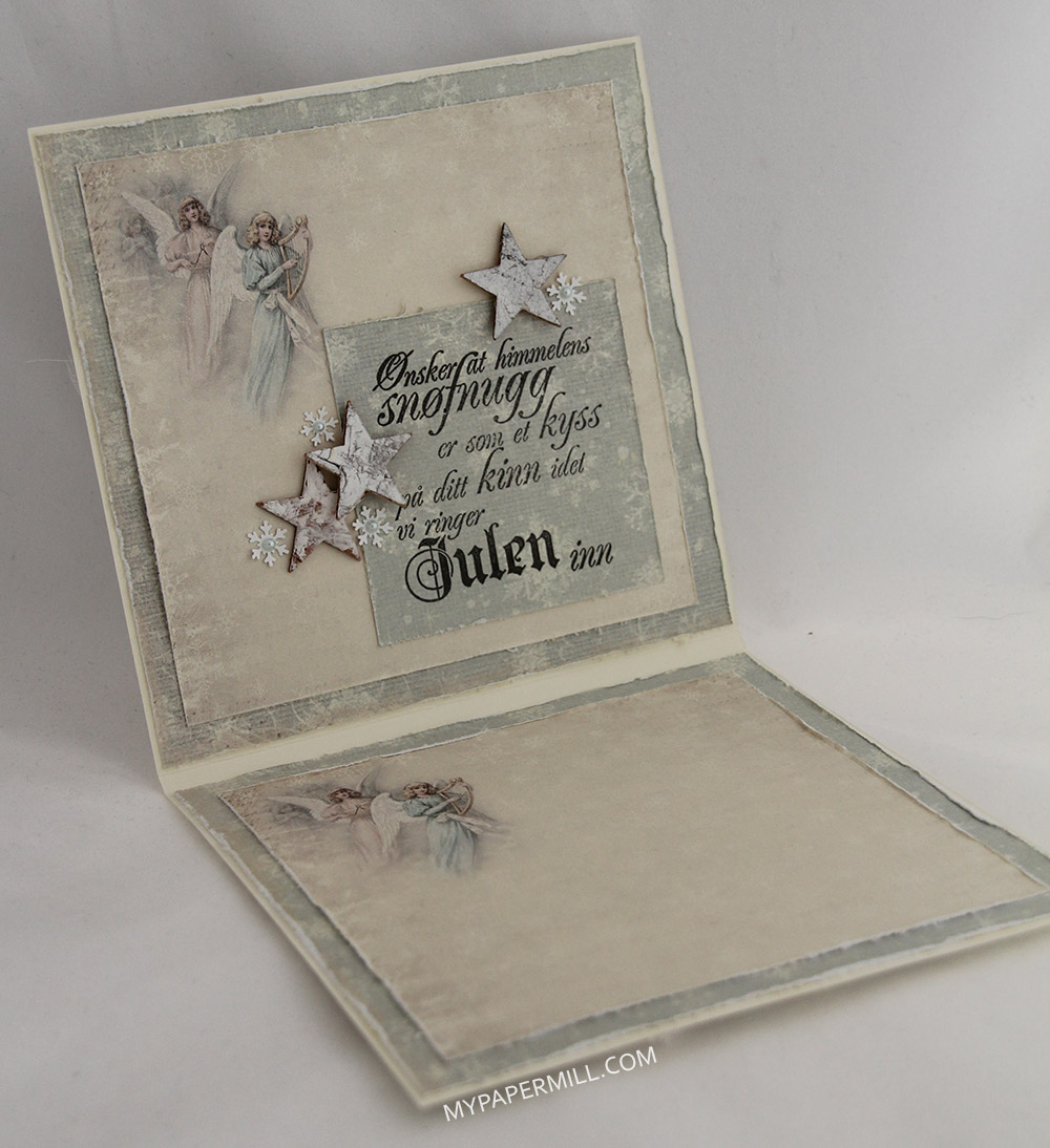 Siden mottakeren av kortet er veldig glad i engler har jeg brukt Angels choir i 6×6″ som jeg har kuttet litt i begge retninger for å få frem det lyseblå arket med snøfnugg bak. Ønsker at himmelens snøfnugg er et stempel fra North Star Design, stemplet med Memento Espresso Truffle, som er min “go to”-farge av stempelputer! Den andre innsiden har god plass til å skrive en koselig julehilsen.