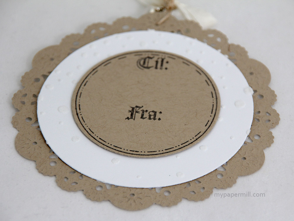 I diecut a heart with a Tim Holtz die and stamped a small Christmas sentiment from Norsk Stempelblad in Memento Rich Cocoa ink. I inked the edges of the heart (and the rest of the card) using Hero Arts Wet Cement shadow ink and added a cluster of berry head stamens behind the heart. The cluster is a mix of Kort & Godt and Magnolia berry head stamens. The little star is from Kort & Godt.