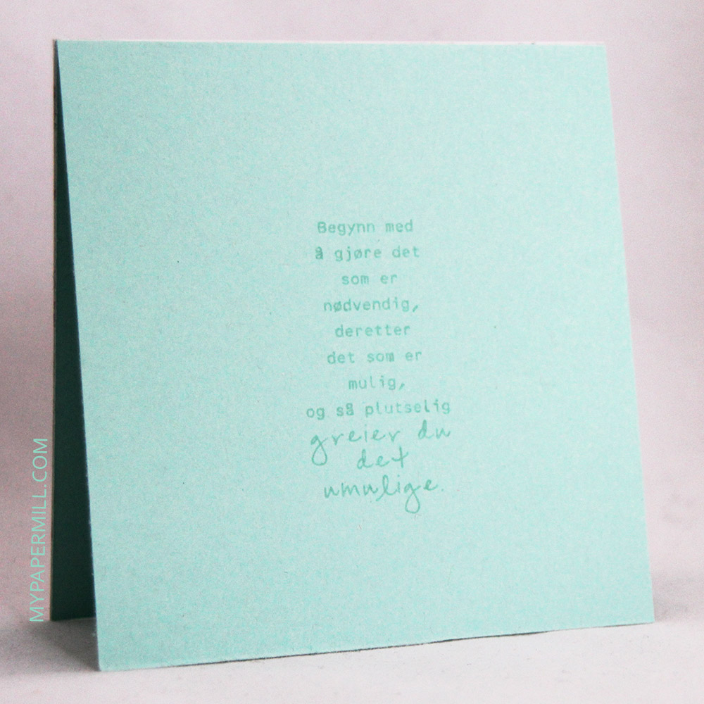 The sentiment stamp on the back is also from North Star Design. The same goes for one of the postmark stamps. The last postmark stamp (the one with the date) is from a Kort & Godt stamp set.