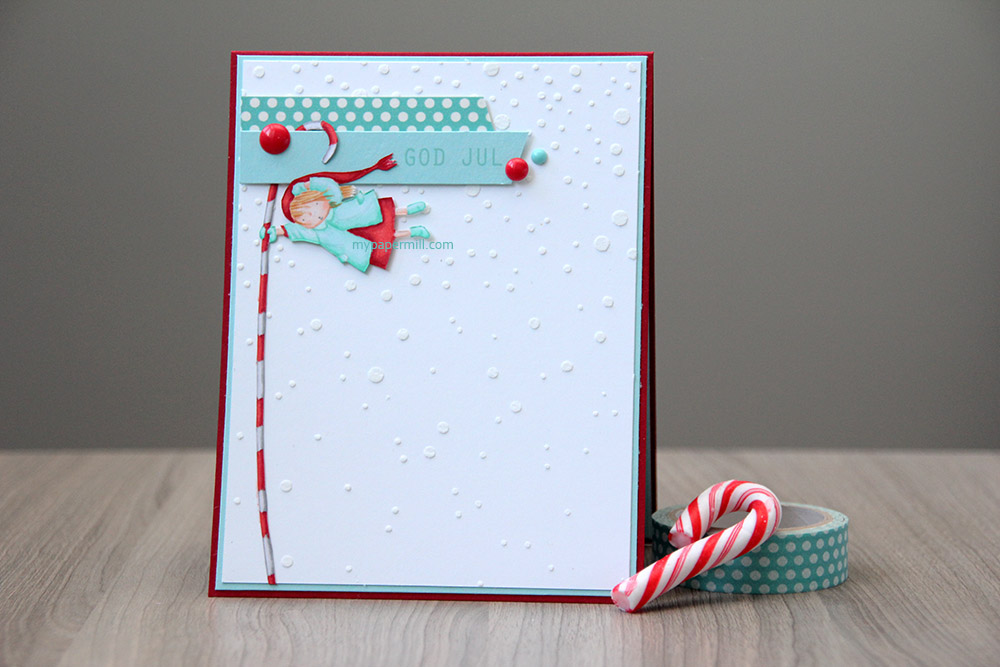 I used Schoolhouse Red cardstock from Simon Says Stamp for my card base, and Surf Blue for the rest (also SSS). The white is Classic Smooth White cardstock from Bazzill. I used my SSS Falling Snow stencil with some Wency Vecchi embossing paste to make my background. The little turquoise bit with the white dots is actually washi tape from Glitz, glued to a scrap piece of paper for the occasion and cut at an angle at one end. The sentiment is from one of the new stamp sets Norsk Stempelblad released in September. I used 3D foam for my sentiment strip (and the girl), with some My Mind’s Eye enamel dots added at the end.