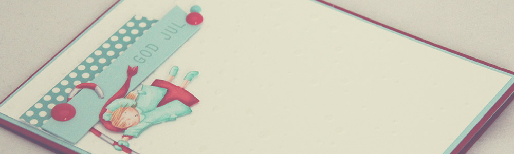 Basen på kortet er Schoolhouse Red-kartong fra Simon Says Stamp, den turkise kartongen er Surf Blue, også den fra SSS. Den hvite kartongen er Classic Smooth White fra Bazzill, og jeg har brukt Falling Snow-stensilen fra Simon Says Stamp sammen med embossingpaste fra Wendy Vecchi til å lage snøbakgrunnen min. Den turkise biten med prikker er faktisk washi tape fra Glitz, for anledningen limt til en bit restekartong og skråskjært i den ene enden. “GOD JUL” er et stempel fra en av de nye platene til Norsk Stempelblad, lansert på StempelScrapmessa i september. Banneret med teksten er proppet opp på lave 3D-puter (det samme er jenta), og noen enamel dots fra My Mind’s Eye er satt på til slutt.