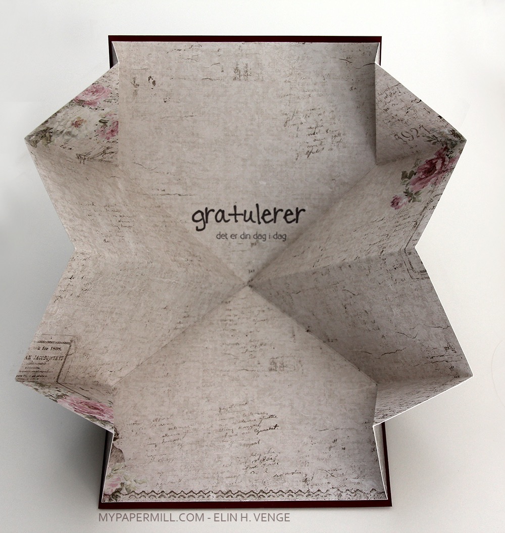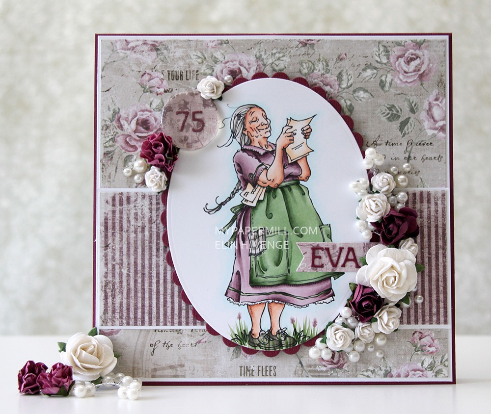 Jeg har laget et lilla kort med Mummu denne gangen, på bestilling til en sprek dame som fyller 80 år. Jeg har brukt en die fra GoKreate til å lage formen på kortet med de herlige papirene fra Skal vi ta en Fika?-kolleksjonen til Maja Design.