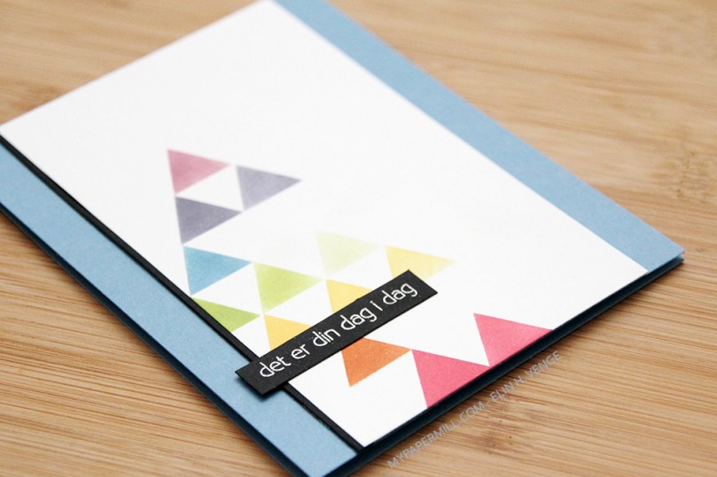 Jeg brukte maskeringsteip til å maskere trekantene mine og svertet med Memento Lady Bug for de røde trekantene, Simon Says Stamp Orange Peel for den oransje, Memento Dandelion for de gule, Simon Says Stamp Green Apple for de grønne, Papertrey Ink Blueberry Sky for den blå, Papertrey Ink Plum Pudding for de lilla og Papertrey Ink Autumn Rose for den rosalilla. Jeg stemplet og embosset en tekst fra Norsk Stempelblad AS som jeg limte rett på panelet med trekantene.