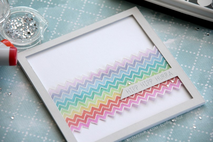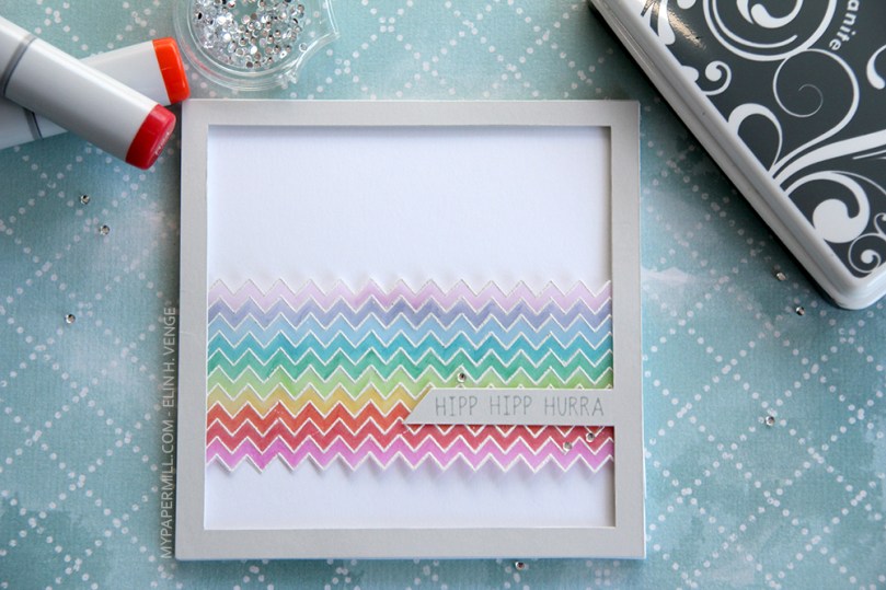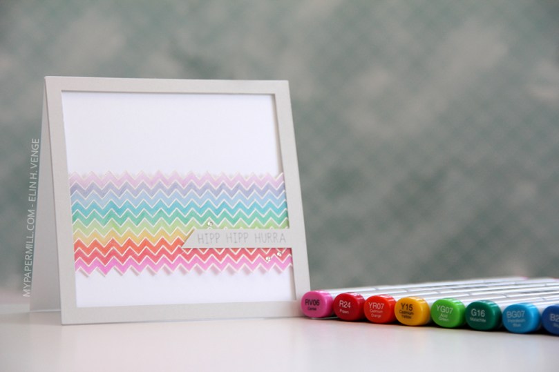 Jeg stemplet et sikksakkstempel fra Papirdesign flere ganger etter hverandre og embosset i hvitt. På baksiden farget jeg med Copics i regnbuerekkefølge. Det er viktig å ikke farge med tusjene på samme side som embossingen, siden tusjtuppene vil bli ødelagt hvis de kommer i kontakt med embossingen.
