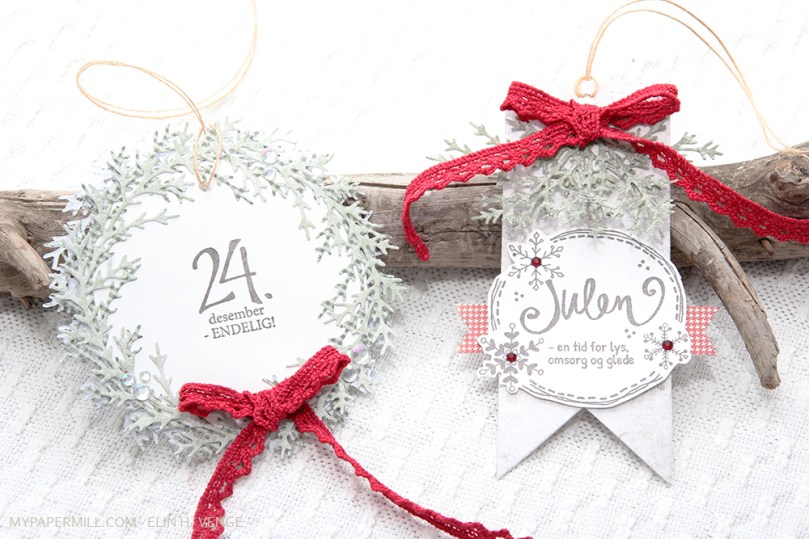 Det kan nesten virke som jeg har slått meg, for jeg lager veeeeeldig sjelden noe som er rødt og grønt. Faktisk så sjelden at jeg ikke kan huske at jeg noengang har gjort det. Ok, så er grønnfargen her veldig svak, men den er der på alle kvistene. Jeg valgte å lage en sirkelformet pakkelapp og en vimpel. 24. desember-stempelet kommer fra B04-platen og den drodlede sirkelen fra B05-platen.