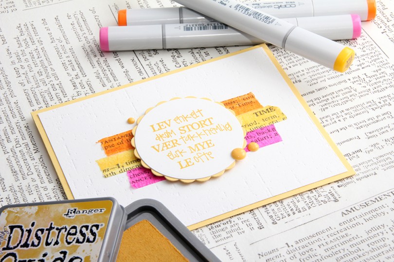 Jeg kjørte hvit kartong gjennom BigShot-maskinen min med en impression plate fra Papertrey Ink, da ble det hvite panelet mitt debosset og så med en gang litt mer spennende ut enn vanlig flat, hvit kartong. Jeg la på tre strimler med min hjemmelagde washi, stemplet et stempel fra Norsk Stempelblad AS med Distress Oxide Fossilized Amber, stanset det ut til en sirkel, stanset ut en gul scallopsirkel som jeg monterte teksten på og proppet det hele opp. Det hvite panelet satte jeg på en gul kortbase av kartong fra Papertrey Ink og pyntet enkelt med noen enamel dots fra My Mind’s Eye.