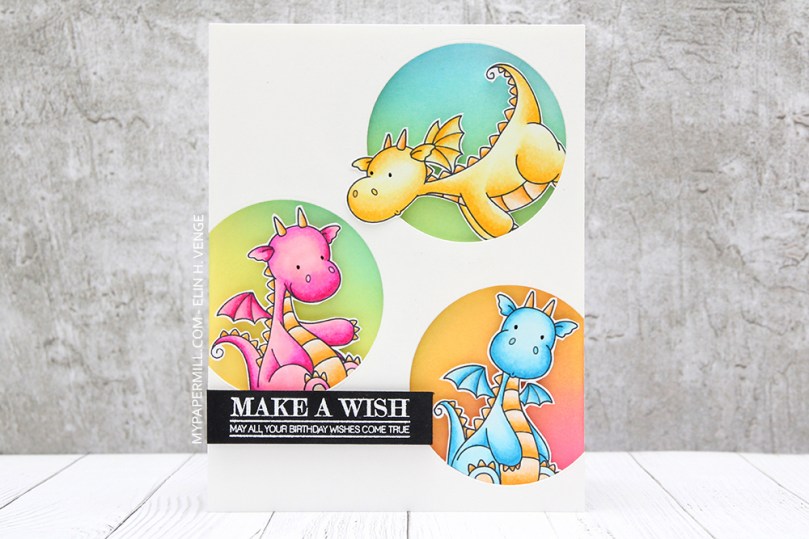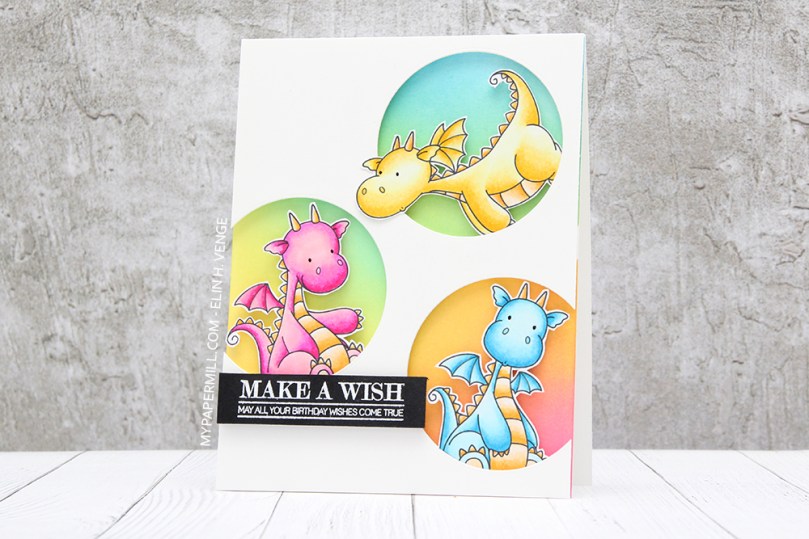 Jeg har svertet Distress Oxide Ink på bakgrunnen min (Salty Ocean, Cracked Pistachio og Twisted Citron bak den gule dragen, Cracked Pistachio, Twisted Citron og Fossilized Amber bak den rosa drgen og Fossilized Amber og Picked Raspberry bak den blå dragen). Tanken var å ha kalde farger bak motiver i varme farger og motsatt, samtidig som jeg ville at det skulle se ut som om overgangene var naturlige fra den ene sirkelen til den neste.