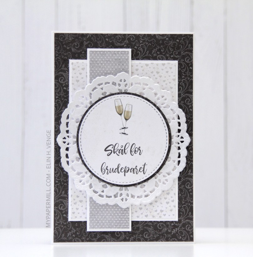 Hei og hopp! Her i Oslo hoppet vi glatt over våren og gikk rett fra vinter til sommer. Sommeren er høysesong for bryllup, og jeg fikk bestilling på et bryllupskort som skulle være uten farger. Bruden vil visst aller helst ha svart brudekjole, så det er litt utenom det vanlige, kan man si. Jeg valgte å lage et relativt enkelt kort med ark fra den nye bryllupsserien til Papirdesign – Bryllupsfest heter den.