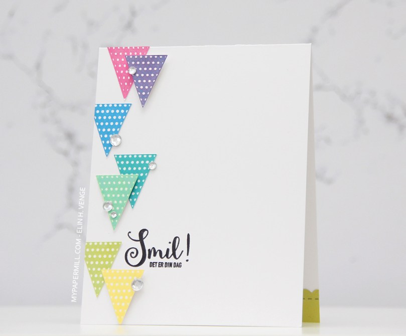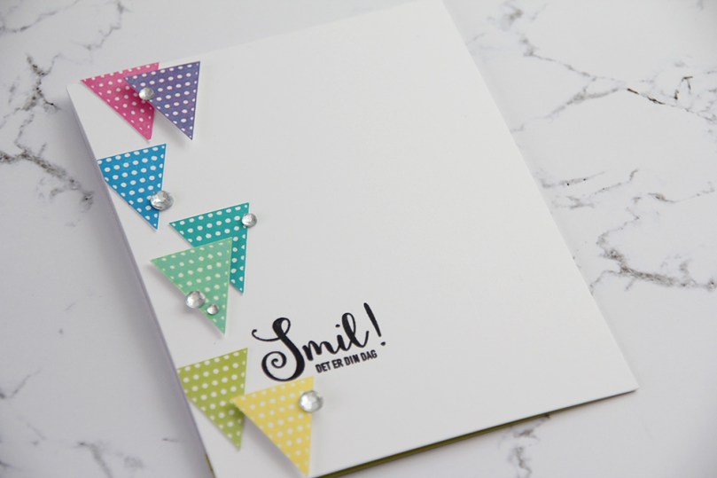Jeg har brukt kun to stempler på dagens kort – fra to forskjellige stempelplater. Vimpelstempelet har jeg stemplet i forskjellige blekkfarger, skjært ut og limt på kortbasen. Noen steder har jeg limt dem rett på kortbasen, andre steder med 3D-puter og 3D-teip i forskjellige høyder.