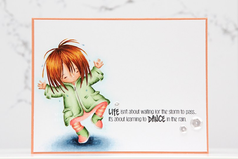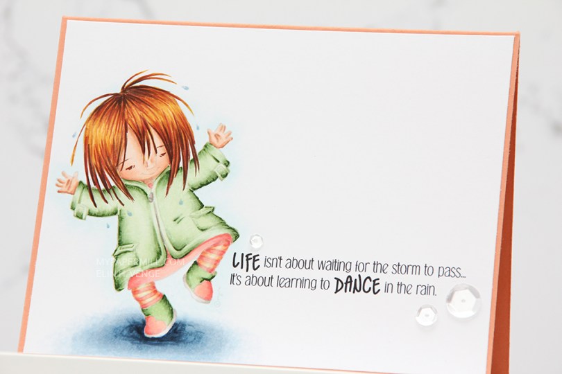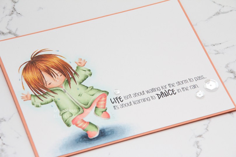 Måten jeg har stablet rammene på gjorde at jeg hadde et lite tomrom et stykke opp på kortet. Plassen var i akkurat passe størrelse til å stemple en tekst, og stempelet jeg valgte fra Grattis-platen til Norsk Stempelblad AS passet PERFEKT.