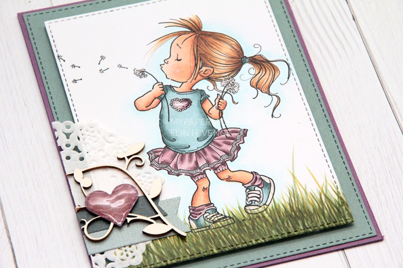 I colored my bears with Copics, fussy cut them and put them in polaroid frames diecut with a Papertrey Ink die. I’ve diecut all the frames in differend colors of Papertrey Ink cardstock (Pure Poppy, Orange Zest, Harvest Gold, Simply Chartreuse, Blueberry Sky, Enchanted Evening, and Royal Velvet), and the colors of the gifts, ballooons, muffins and hearts match the colors of the individual frames.