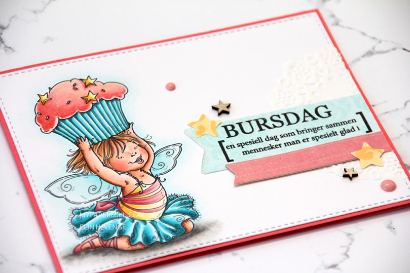 I put a tiny cluster on the inside. Another banner diecut using an MFT die, another veneer star and also a polaroid frame, diecut with another MFT die – told you they’re my favorite. A couple of punched little pink hearts and another Norsk Stempelblad AS sentiment (Happiness is being one year older), and my card was done.