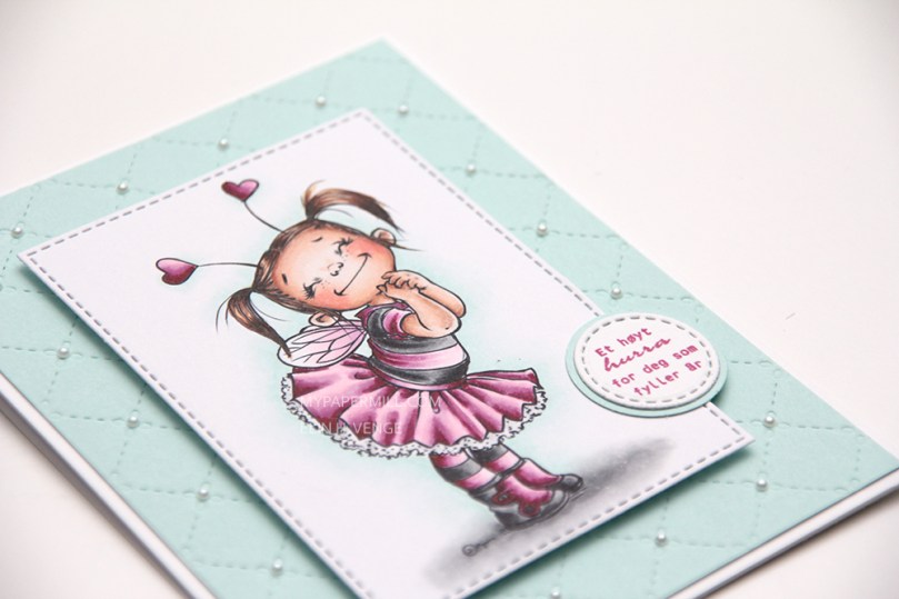 I diecut my sentiment using a small stitched circle die, also from MFT. I punched out a 1″ circle out of some Aqua Mist cardstock that I glued my stitched circle to. I stamped a Norsk Stempelblad AS sentiment in a combination of Doll Pink ink from Simon Says Stamp and Autumn Rose ink from Papertrey Ink. Neither of the colors matchet my image on their own, but together they were perfect.