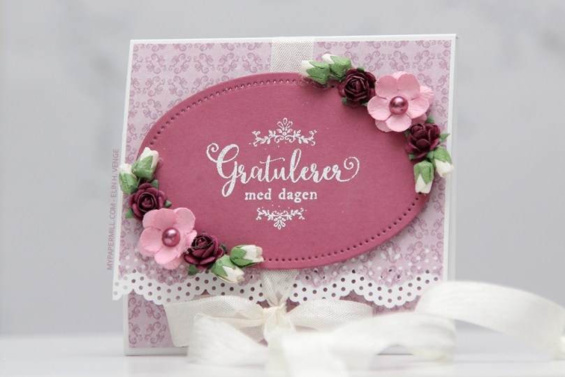 Når kortet er lukket ser det ganske lite ut, det måler i underkant av 4×4″. Jeg har pyntet veldig enkelt med blomster og erstattet midten av de rosa blomstene med perler. Teksten har jeg embosset i hvitt.