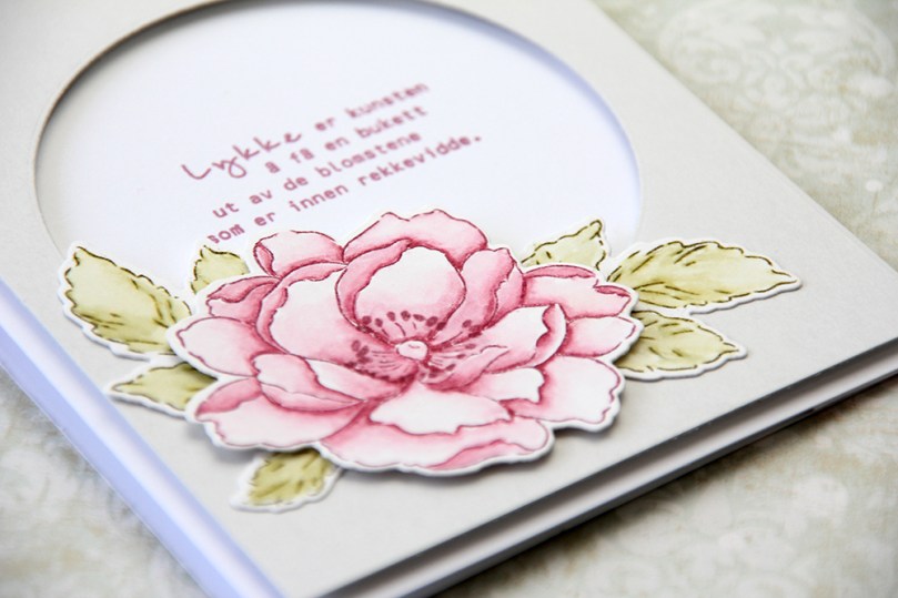 Jeg stanset ut en sirkel av det grå panelet mitt (Soft Stone kartong fra Papertrey Ink) og limte hele panelet på kortbasen (Stamper’s Select White kartong fra PTI) med 3D-teip. Bladene er limt rett på den grå kartongen, mens rosen er løftet enda litt høyere opp med lave 3D-puter. Teksten fra Norsk Stempelblad AS (Livet) er stemplet med Autumn Rose blekk.