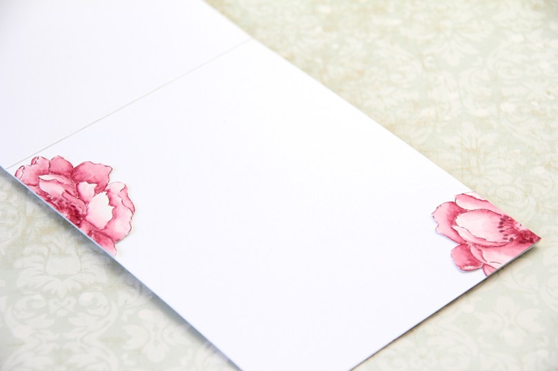 Jeg fargela i utgangspunktet to blomster. Jeg hadde aldri prøvd Zig-tusjene på Bristol Smooth før, så jeg trengte en prøverunde. Den første blomsten jeg fargela delte jeg i tre og satte på innsidene av kortet. Det er litt mer farge – og sånn sett også litt mer liv – på denne, men jeg ville ha et veldig dust uttrykk på forsiden av kortet, derfor havnet den lyse varianten på fronten.