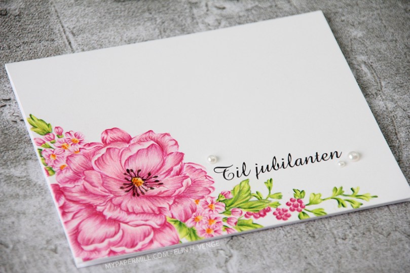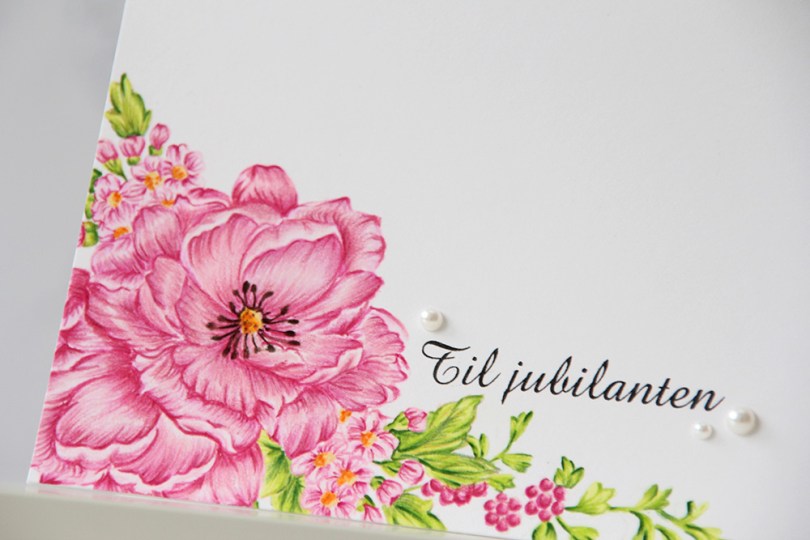 Jeg brukte ikke mange fargeblyanter heller, men det tok litt tid. Jeg hadde ikke brukt fargeblyanter over Copic-tusjer før, så jeg lærte underveis. Det siste jeg gjorde var å stemple en tekst fra Gratulerer-platen til Norsk Stempelblad AS med svart blekk og lime på tre hvite halvperler fra Papirdesign, og det er hele kortet. Enkelt i utseende, men tidkrevende å fargelegge, så det er ikke masseproduksjonsvennlig akkurat, men det er vanligvis ikke kortene mine likevel, det er ikke noe mål.