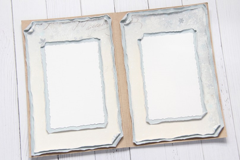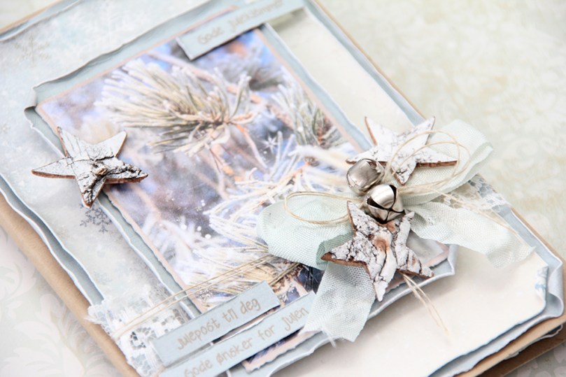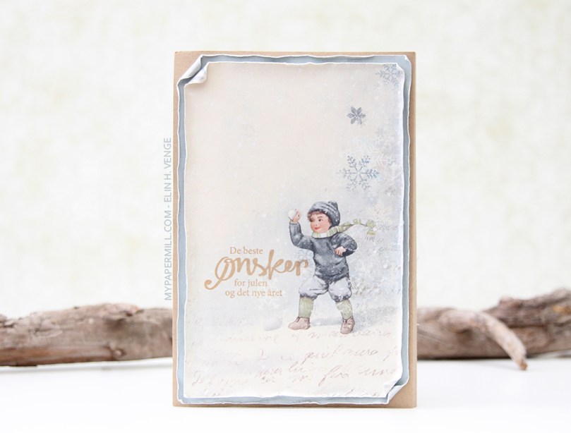 Av de tre kortene jeg lagde tror jeg dette er favoritten min. Det er noe med fargepaletten jeg syns er veldig innbydende. Som på de andre to kortene har jeg brukt ark fra Joyous Winterdays-kolleksjonen til Maja Design, med motiv fra Studiolight og kraftkartong som kortbase. Også her har jeg fuktet og krøllet arkene mine.