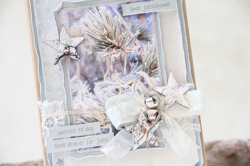 Jeg ville ha enda mer pynt, men fikk ikke helt snøfnugg til å passe på dette kortet. Jeg hadde noen gamle barkestjerner fra Kort & Godt liggende – de var perfekte. Jeg stemplet noen småtekster fra Norsk Stempelblad AS på den samme lyseblå kartongen med Classic Kraft blekk fra Papertrey Ink og limte tekststrimlene mine på kortet.