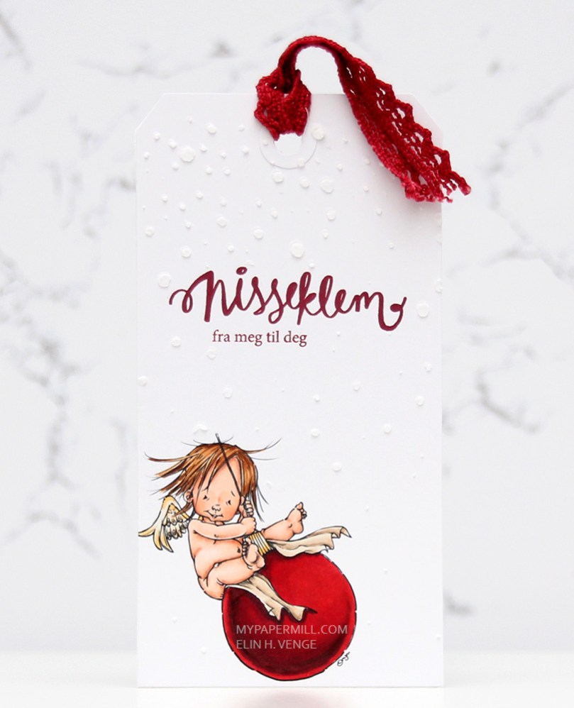 Jeg fargela motivet med Copics, stanset det ut til en stor tag og maskerte motivet før jeg brukte en stensil og embossingpaste til å lage snøfnugg rundt. Nisseklem fra meg til deg er to sammensatte tekster fra Norsk Stempelblad AS, stemplet med Papertrey Ink Scarlet Jewel blekk. Jeg festet en liten bit rødt bånd i hullet på tagen – enkelt og greit.