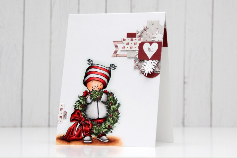 I’ve colored up Got the Wreath with my trusty Copics in reds and grays. I’m not normally a fan of red, but I’m happy when I can make it a deep, brownish red and pair it with gray. That works in my world. Red and green, not so much. I had to color the wreath with greens, though, and I don’t think there’s too much of it, so it kind of works and the green doesn’t compete with the red for all the attention, which is sometimes an issue when using complementary colors.