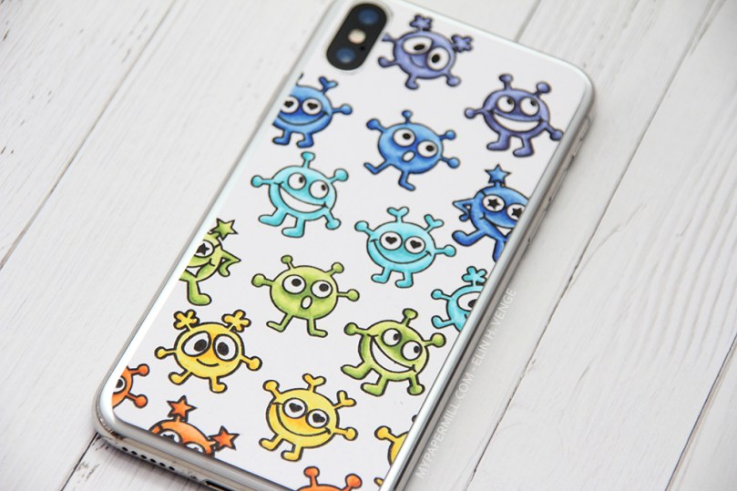 Hei og hopp! Jeg har et nytt “telefondeksel” å vise frem i dag, denne gangen med søte monstre fra Huldra designstudios monsterplate. Jeg har stemplet alle fem monstrene i settet, farget dem ferdig, og stemplet dem én gang til på samme sted med VersaFine. Da blir kantene fine og svarte, og jeg kan fortsatt bruke Copics, siden jeg ikke bruker VersaFine før monstrene er ferdig fargelagt. Prosessen gjentas ved å rense stemplene (viktig for at den svarte VersaFine-fargen ikke skal sverte av til de neste monstrene), plasserer stemplene der jeg vil ha dem, stempler med svart, Copic-vennlig blekk, fargelegger og stempler over med VersaFine når monstrene er ferdig fargelagt. Og sånn fortsatte jeg til hele “dekselet” var ferdig. Da var det bare å klippe til og feste dekselet til telefonen. Lett som en plett!
