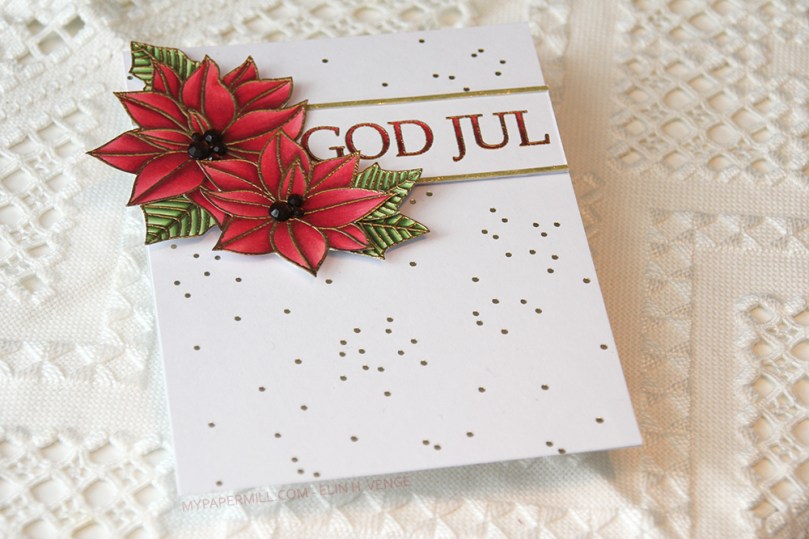 Jeg stemplet en tekst fra en stempelplate fra Huldra designstudio på samme måte som jeg stemplet blomstene. Jeg fargela inni bokstavene, stemplet over med VersaMark og så embosset. Jeg satte tekstpanelet på lave 3D-puter og limte på en tynn strimmel gullkartong over og under for en liten ekstra gulldetalj. Klippet ut blomstene og bladene og limte dem på tekstpanelet og satte krystaller fra Papirdesign i midten av blomstene.