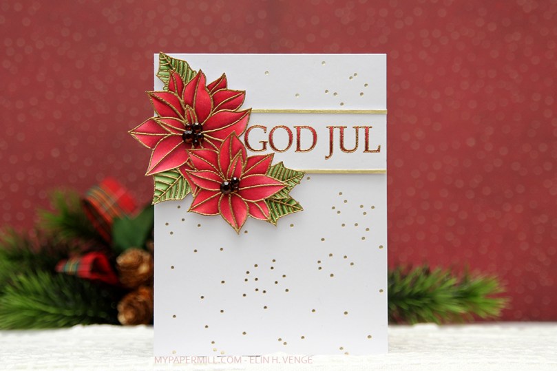 For rimelig nøyaktig ti dager siden fikk jeg spørsmål fra Connie (eier av Hobbykunst) om jeg ikke hadde lyst på flere rosa Post-it-lapper på veggen min, så nå er jeg offisielt på designteamet til Hobbykunst!!! Woohoo!!! Siden vi begynner å nærme oss jul med stormskritt, har jeg et enkelt julekort å vise frem i dag. De som kjenner meg godt vet at det er to typer julekort jeg ikke lager – julekort med blomster og røde julekort. Jeg har en slags sperre når det gjelder det, men fikk en liten utfordring i et stempelsett med julestjerner fra Pretty Pink Posh. Jeg liker utfordringer, så dagens kort har både rødt og blomster.