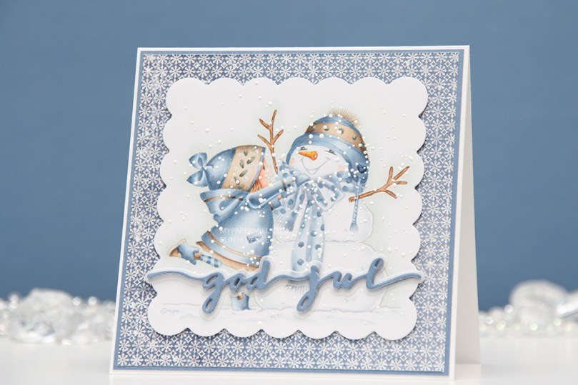 I added my panel to a piece of patterned paper from Maja Design using some dimensional adhesive. Matted it with blue Maja Design cardstock, then glued everything to my cardbase. I’m not a fan of big borders around my panels on my cards, but 1/16″ is perfect!