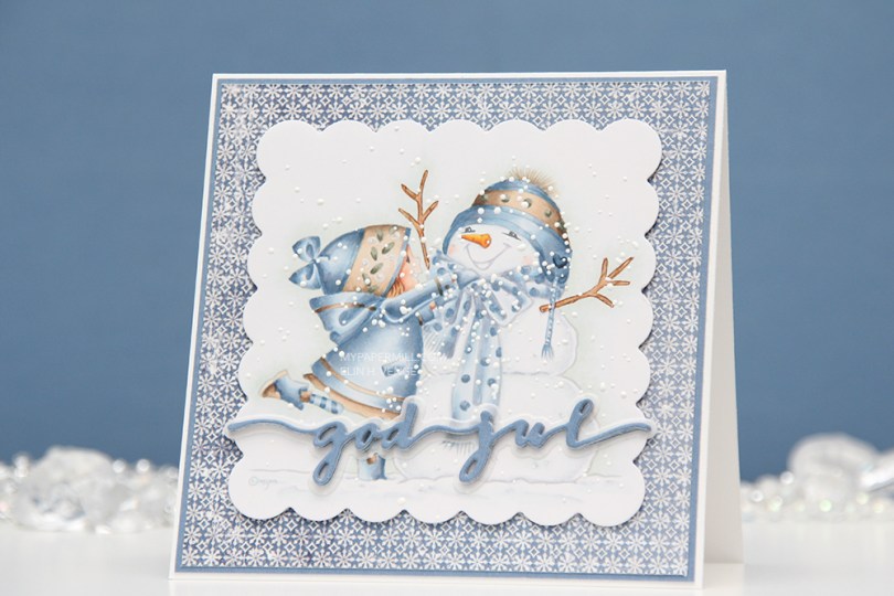 I diecut god jul using a Papirdesign die four times with the same blue cardstock, stacked them together, glued them to a vellum shadow and glued that directly to my image for a quick, easy sentiment.