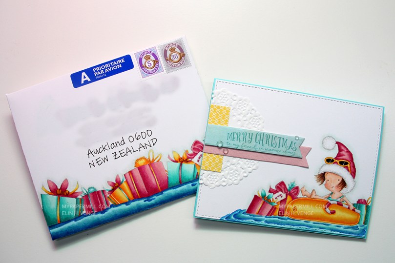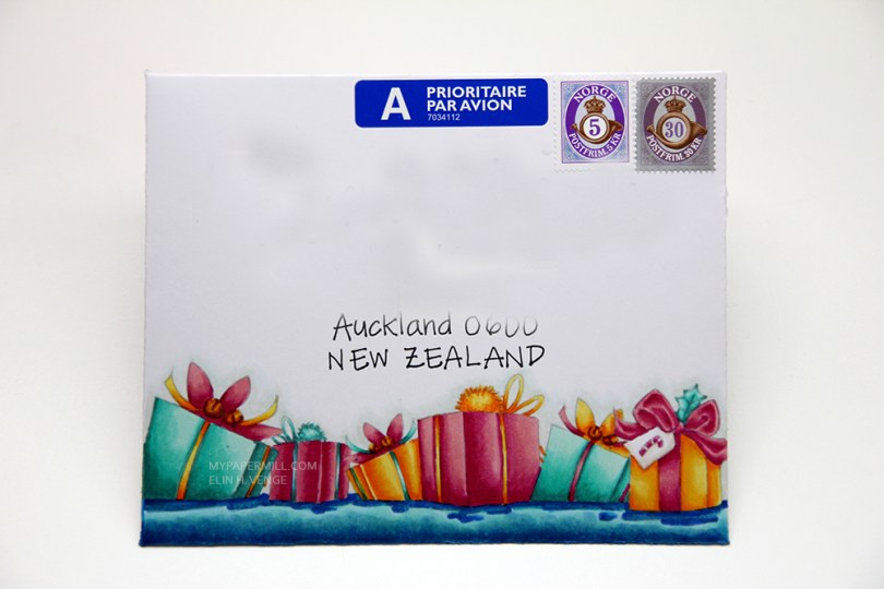 I resized, flipped and merged the presents from Christmas Pool Tot, before lowering the opacity and printing my image to X-Press It blending card, which, in my opinion, is by far the best paper for Copic coloring. I colored my presents in much of the same colors as I used for the card, and turned my piece of X-Press It into an envelope using the envelope punch board from We R Memory Keepers. Added the recipient’s name and address (erased most of it in PS, I don’t want to blast it all over the internet) and a couple of stamps, and off to New Zealand it went!