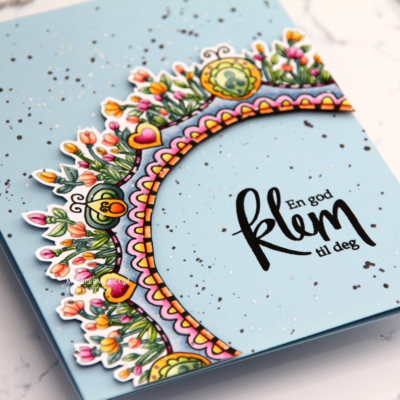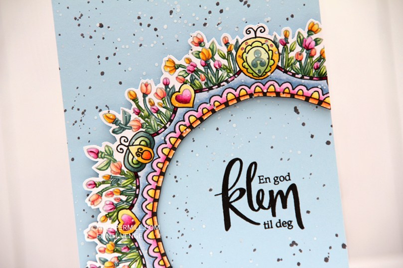 I stamped a Norsk Stempelblad AS sentiment using VersaFine Onyx Black ink, and added splatters across the entire card with white liquid watercolor from Hero Arts and a watered down black ink.