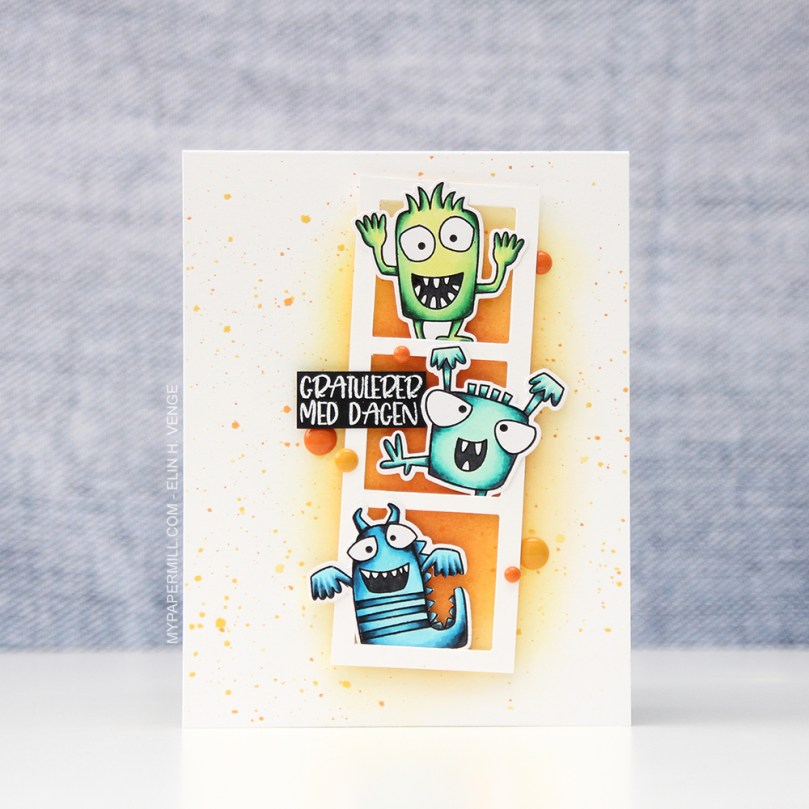 I had four monsters, so Liz urged me to put the last one on an ink blended circle on the inside. I asked her if she wanted paint splatters on the inside too, before I removed my circle mask. She wanted water splatters, so I added water splatters. I had a great time being remote controlled by her!