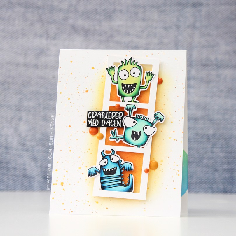 The first decision was to diecut those monsters from My Favorite Things. I usually like fussy cutting, but Liz decided that diecutting was the way to go with this one. She pretty much ran the show, I just did as she asked. I made my little frame and decided where it needed to go before going in with orange and yellow inks on the cardbase.