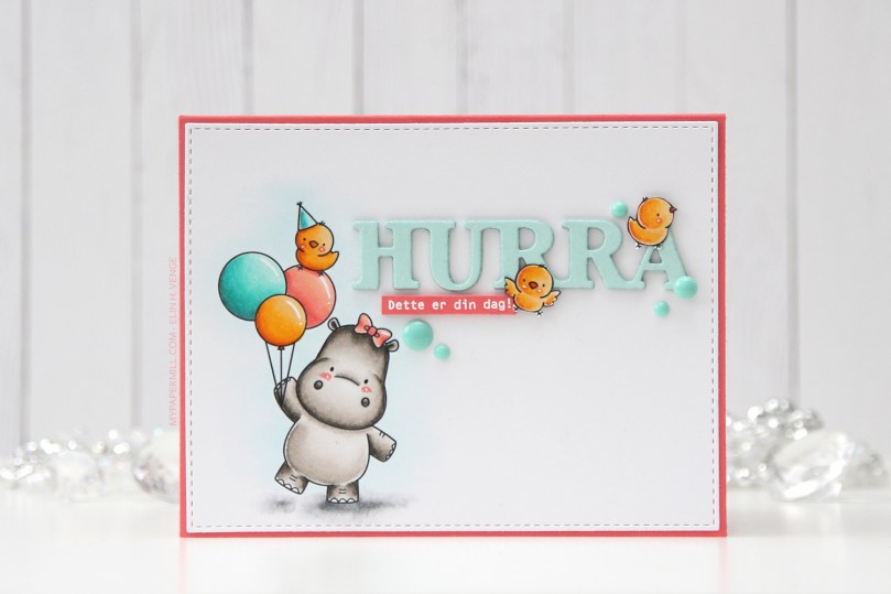I diecut a word die from Kort & Godt four times from Aqua Mist cardstock and glued them all together for a stacked look. There was just enough space above the head of that hippo for the word to fit nicely. I stamped and white heat embossed a Norsk Stempelblad AS sentiment on a piece of that Berry Sorbet cardstock and added three more layers behind that, so it’s flush with the word above.
