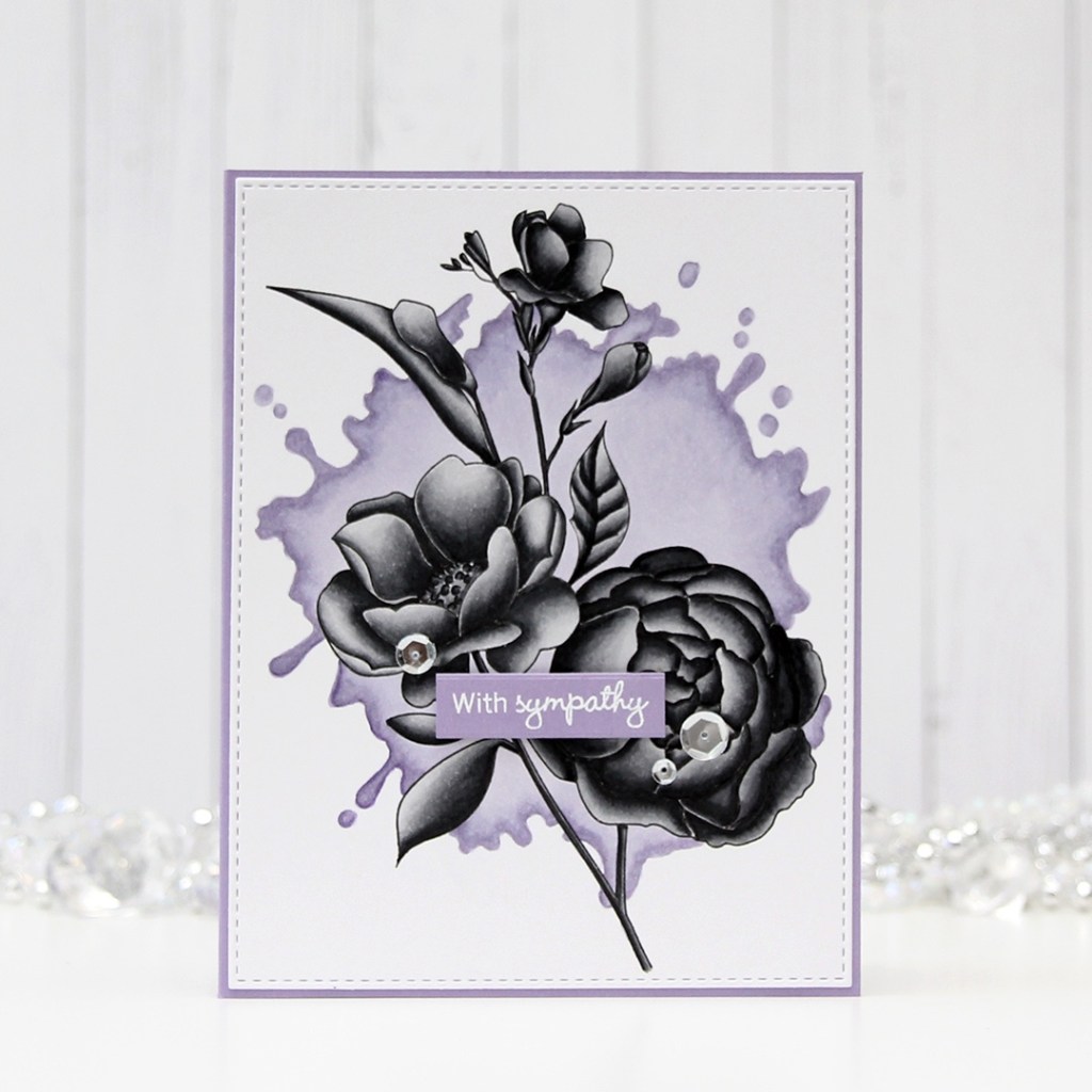 I colored up these flowers for day 20 of the current round of Kathy Racoosin’s 30 day challenge. I wanted a challenge, and a friend told me to color grayscale flowers. I did as she asked and added a purple ink splatter backdrop with my Copics to get a little bit of color in there.